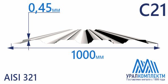 Листы профилированные С21 из нержавеющей стали часто применяются для строительства ограждающих конструкций. В зависимости от используемой марки стали этот материал может применяться и в узкоспециализированных областях. Так, профнастил из стали AISI 321 в своем составе содержит большое количество никеля, поэтому он имеет высокую жаропрочность. В связи с этим такой материал широко применяется в средах с высокими температурами (до 800 градусов). Однако этот металл не устойчив в среде с содержанием серы, поэтому его не рекомендуют использовать в окисляющих средах.
